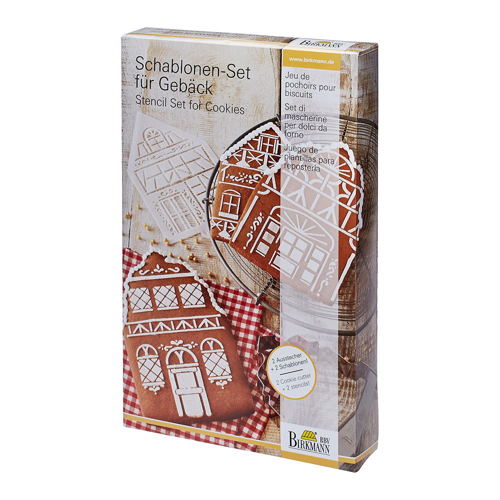Lieferumfang: 2 große Ausstechformen, 4 verschiedene Schablonen zum verzieren des Gebäcks und eine Bedienungsanleitung inkl. Rezept