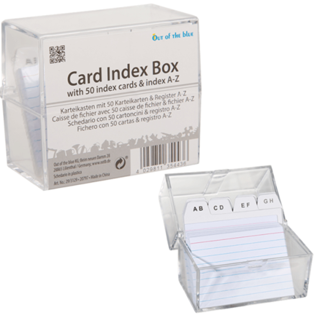 Lieferumfang: 1 Karteikasten inkl. 50 linierten Karteikarten und Register A-Z